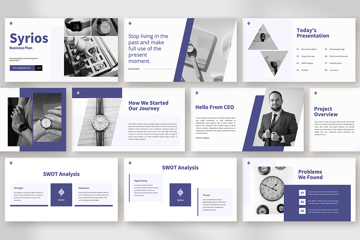 在白色背景上使用紫色和黑色可以营造出醒目的外观,帮助观众将注意力集中在演示文稿中的信息上。其现代风格保持了公司或商务演示的专业氛围。此外,它没有过多的装饰元素来分散观众的注意力。因此,您需要做的就是自信地交付计划。不要局限于将此模板用于商业计划,因为您可以将其应用于其他演示文稿,例如公司简介、业务报价等。