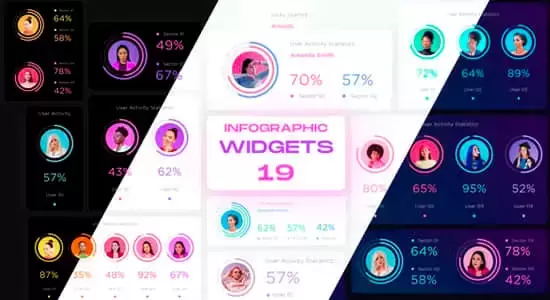 此用户活动信息图片小工具包包含19个不同的信息图片小工具,有3种颜色版本。